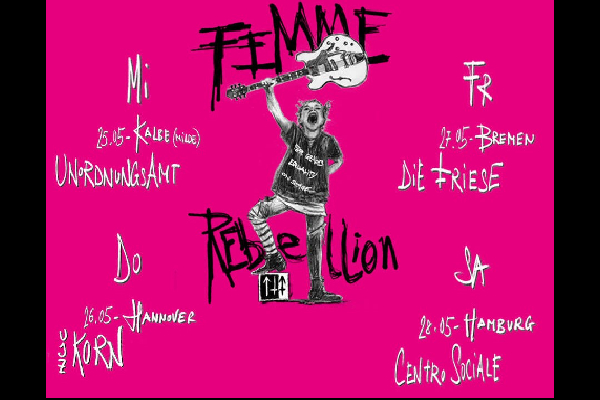 Femme Rebellion möchte einen hierarchiefreien Ort für Musiker_innen und Musikinteressierte jeglichen Geschlechts schaffen und mit den bisher immer noch geltenden sexistischen Rollenverteilungen in der Musikszene brechen. Egal, was sie Euch erzählen, die Bühne ist für alle da!