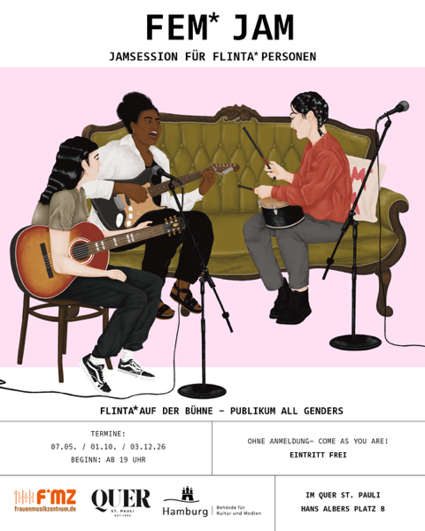 f*mz and Quer St. Pauli invite you to a evening full of improvised music, sound experience, new people and creativity. With FEM*Jam, we aim to empower, inspire, and connect FLINTA* persons in their musical journey. These jam sessions are also a wonderful space to experiment, try out different instruments and music genres and showcase your passions. It’s not about playing your instrument perfectly but about creating together, listening, inspiring one another, and sharing experiences. Everyone* is welcome to participate. A respectful interaction is essential. The stage is reserved for FLINTA* individuals, but the audience is open to all genders!