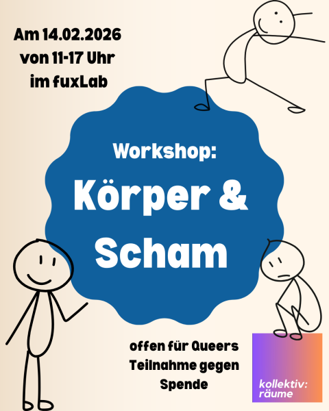 In diesem Workshop wollen wir einen Austauschraum schaffen, um besser zu verstehen, woher Scham kommt, welche gesellschaftlichen Mechanismen dahinterstecken und wie sie sich in Bezug auf unsere Körper ausdrückt. Hierbei möchten wir auch darüber sprechen, welche spezifischen Erfahrungen wir dabei als queere/TIN* (trans*inter*nicht-binär) Personen machen. Gemeinsam möchten wir erforschen, welchen Umgang wir damit individuell und in Gemeinschaft finden können. Wir möchten uns in dem Workshop auf unseren gegenwärtigen Erfahrungen und einen wohlwollenden Umgang damit fokussieren.