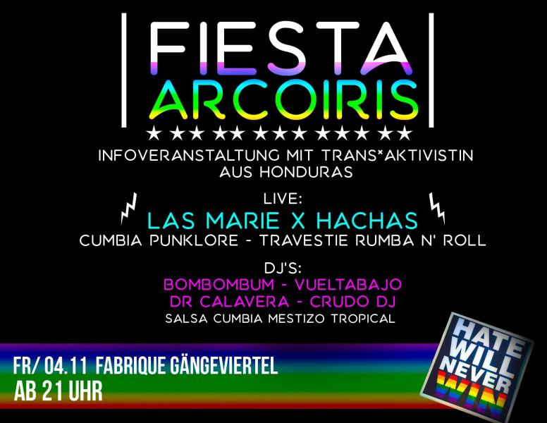 In Honduras haben Menschenrechtsverletzungen und Morde an Umwelt- und Menschenrechtsaktivist_innen im vergangenen Jahr massiv zugenommen. Trotzdem setzen sich Menschen wie die bekannte Trans*Aktivistin Frenessys Sahory Reyes tagtäglich für die Opfer von Hassverbrechen, Morden und Diskriminierung gegen die LGBTI*Community ein und setzen damit ihr Leben aufs Spiel. Frenessys berichtet im Dialog mit euch und einigen Hamburger NGOs über die aktuelle Menschenrechtslage. Mit der anschließenden Soliparty „Fiesta Arcoíris“ wollen wir ihre Organisation Arcoíris in der Hauptstadt Tegucigalpa unterstützen.