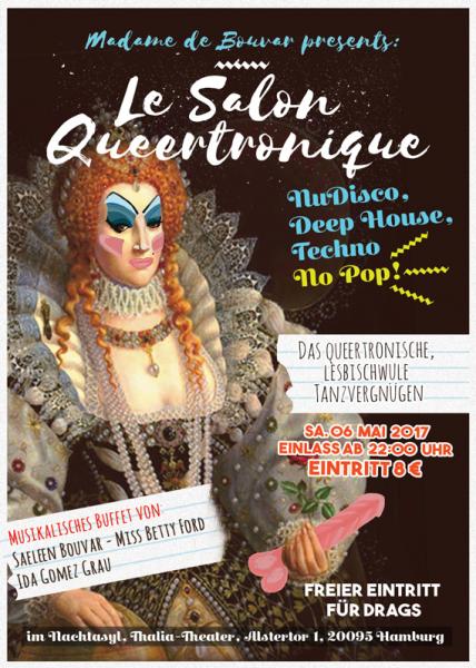 Stolz ist etwas Wunderbares. Es ist der Stolz, der die schönsten Regenbogenfarben in die Gesichter dieser Welt hineinprustet und uns alle leben lässt. Le Salon Queertronique feiert den Stolz mit Klängen von Saeleen Bouvar, Miss Betty Ford und Ida Gomez Grau, ein All-Girl-Lineup. Royale Beats aus den Sparten NuDisco, Deep House und Techno sind zu erwarten. Schnallt die Perücken an, entstaubt die Tanzschuhe und kommt vorbei!