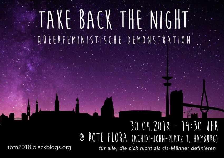 Am 30.04.2018 wollen wir uns in den Hamburger „Partyvierteln“ Schanze und Kiez symbolisch und praktisch die Nacht zurück erobern – die nächtlichen Straßen, die für viele Personen zu einem oftmals beschissenen Ort werden. Wir wollen uns gemeinsam mit allen die sich nicht als cis-Männer definieren in Momenten des Empowerments und der Solidarität kämpferisch Raum nehmen.