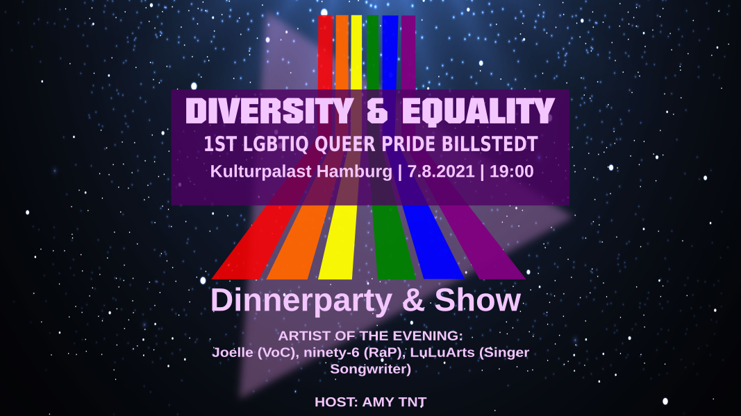 Ist es an der Zeit gemeinsame Gemeinsamkeiten zu verwirklichen und zu entdecken? Ja absolut. Wir freuen uns euch in Billstedt zum möglicherweise ersten Pride Event überhaupt in Billstedt zu begrüßen. Ab 19:00 darf lecker auf der Veranda im Kulturpalast gegessen und getrunken werden. Unterhalten werdet Ihr dabei von Rap Resang PerformanceDrag und Kopfhörer DJ.