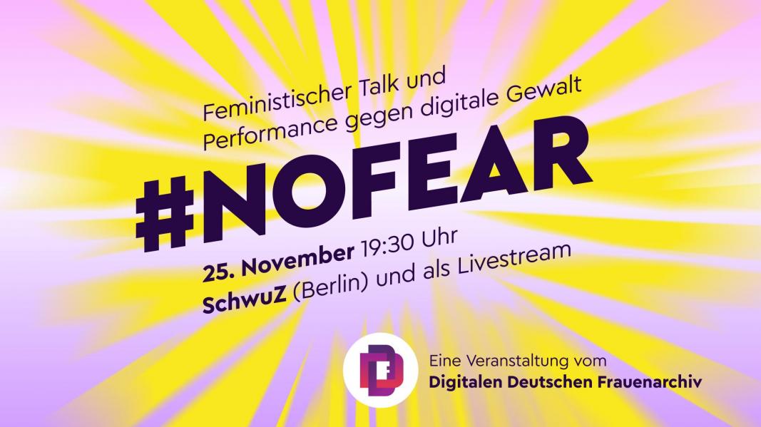 Zum Internationalen Tag gegen Gewalt an Frauen lädt das DDF unter dem Motto #NOFEAR zu feministischem Talk und Performance, u.a. mit Melina Borčak, Ouassima Laabich, Bundesministerin Lisa Paus, Nivedita Prasad, Sookee, Centre Talma und dem Bundesverband Frauenberatungsstellen und Frauennotrufe. Seid dabei – analog im Berliner SchwuZ oder online via Livestream.