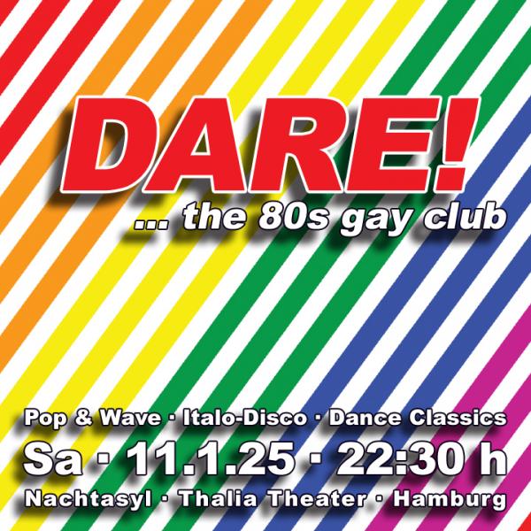 Der erst DARE! Club im neuen Jahr: am 11. Januar 2025 freuen wir uns mit Euch auf das beste aus Pop & Wave, Italo Disco und Dance Classics sowie dem was die schwule Szene der 1980er auf die Tanzflächen brachte.