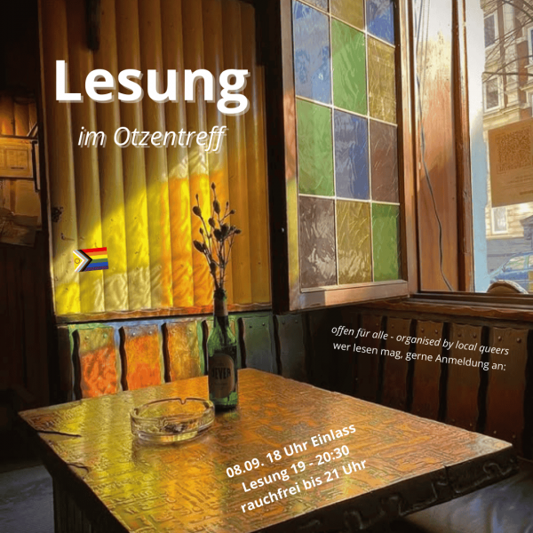 Einlass ab 18 Uhr, Lesung 19:00-20:30, rauchfrei bis 21 Uhr