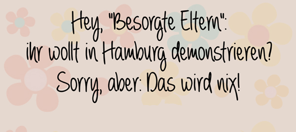 So möchte am 24. Januar 2015 der rechtskonservative Verein »Besorgte Eltern e.V.« in Hamburg demonstrieren, der unter anderem bereits in Stuttgart homophobe und sexistische Aufmärsche mit Charakternazis wie Jürgen Elsässer organisiert hat. Sie behaupten allen ernstes, dass linke Pädagog*innen im Schuluntericht Kinder zwingen, Dildos zu basteln (hätten wir in unserer Schulzeit angesichts unseres damals schmalen Taschengelds tatsächlich praktisch gefunden), demnächst ein »Schulfach Schwul« eingeführt wird (was auch immer sie damit meinen) und überhaupt: alle Menschen, die nicht in heteronormative Zwangsvorstellungen passen, kein Recht auf öffentliche Existenz haben. Bevor die evangelikalen Lurche (nichts gegen Amphibien, aber so geht nun mal Jugendsprache) auf die Idee kommen, dass sie so etwas regelmäßig in Hamburg veranstalten können, muss bereits dieser erste Aufmarschversuch im Keim erstickt werden - auf dass die »Besorgten Eltern« am Abend des 24. Januar in ihren Schmuddelecken im Internet rumheulen, wie gemein diese »linksextremen Homo-Perversen« sind, die ihre Demo verhindert haben.