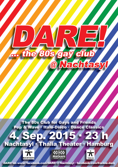 DARE! @ NACHTASYL zum ALSTERVERGNÜGEN 2015 - diesmal am Freitag. Vom Ballindamm zum Thalia Theater, dort liefern wir euch wieder das beste aus Pop & Wave, Italo Disco, Dance Classics und das was die Gay-Szene der 80er Jahre zum tanzen brachte.