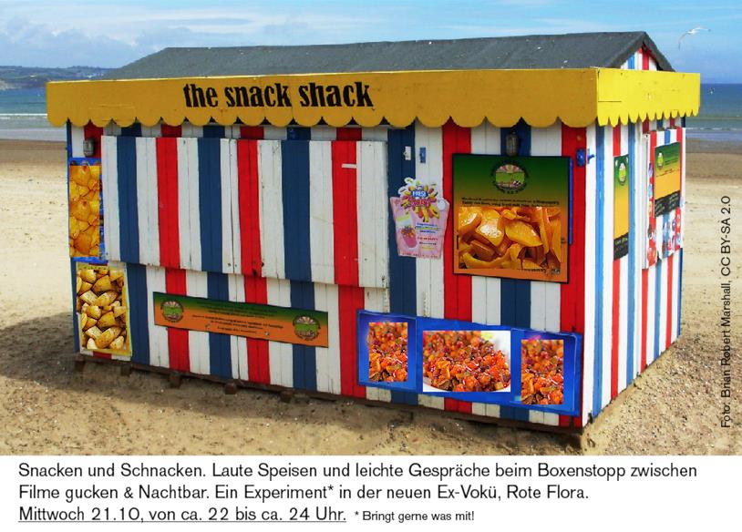 Snacken und Schnacken. Laute Speisen und leichte Gespräche beim Boxenstopp zwischen Filme gucken & Nachtbar. Ein Experiment* in der neuen Ex-Vokü, Rote Flora.